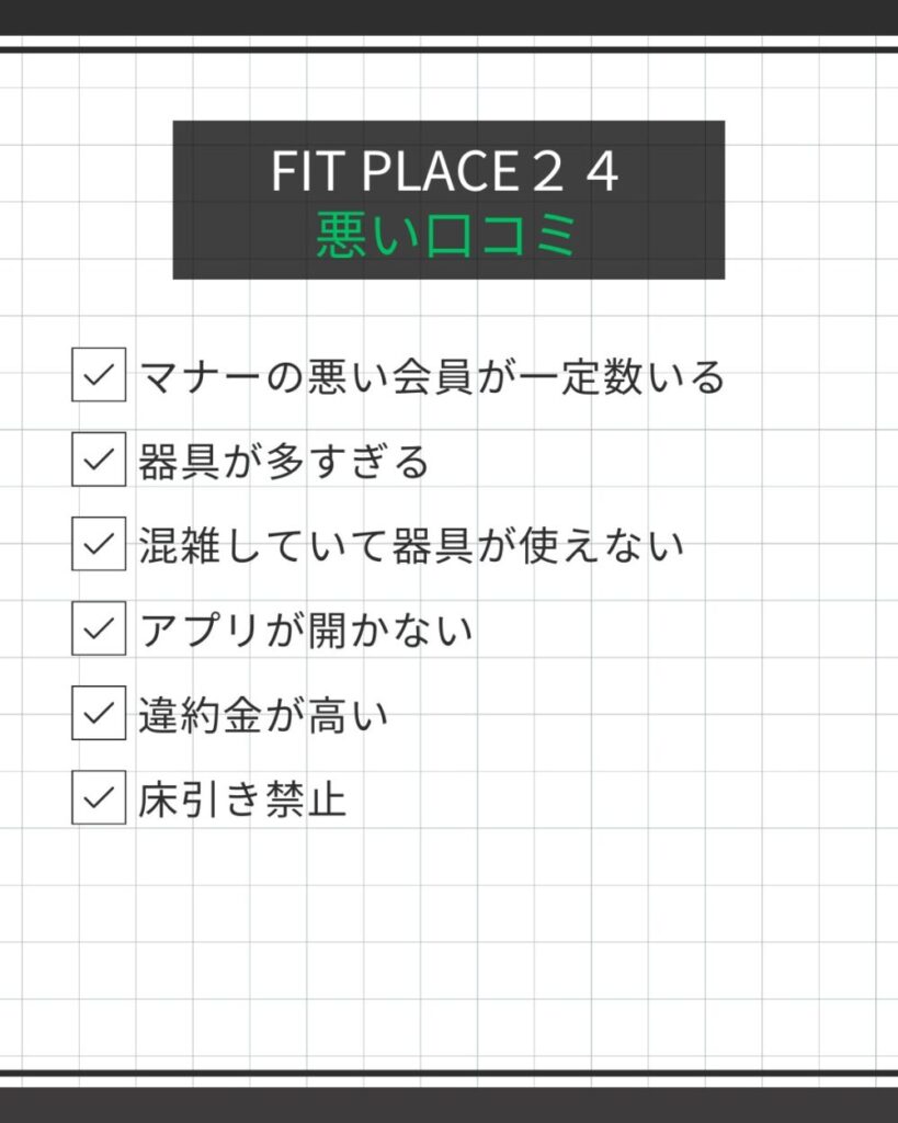 この記事では、悪い口コミといい口コミにフォーカスして、実際にフィットプレイス24に通っている私が行っている、